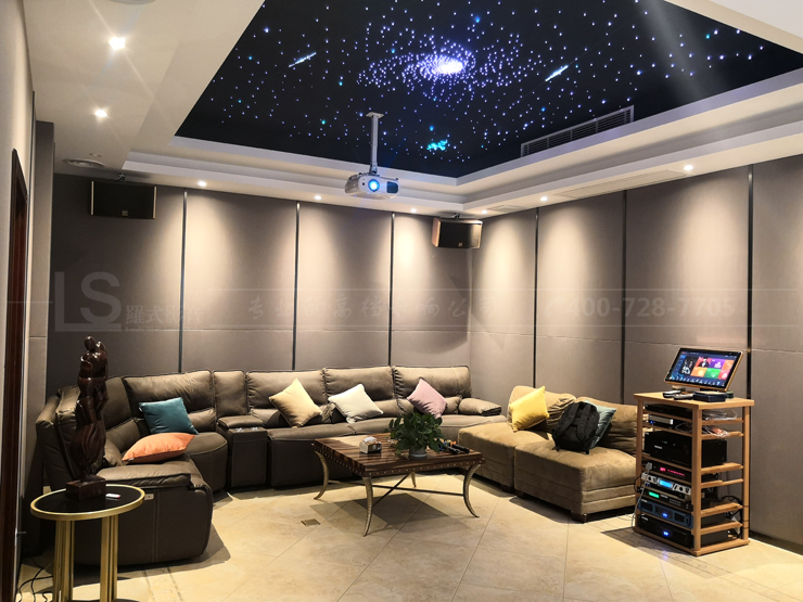 整个音响系统,分为7.1声道的影院系统,及4.0的卡拉OK系统。影院音响室采用嵌入式安装,主音箱置于前墙透声幕布之后,环绕音箱置于沙发周围墙面透声布之后。