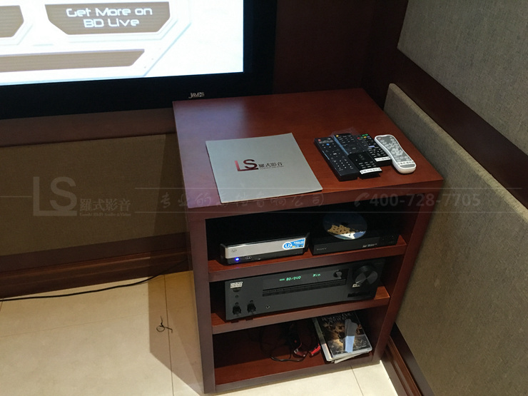 整个功能上来说,原本卡拉OK系统和影院系统式在同一个房间内的,后来考虑到唱歌时人员较多,经和游总沟通确认,我们建议把卡拉OK系统放在影音室外的厅里。影音室里搭配了一台蓝光机和一台硬盘播放器作为信号源,可以看光碟形式的蓝光电影。